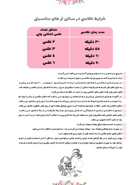 در صورت داشتن عکس خانوادگی ، امکان رزرو تایم از 45 دقیقه به بالا مقدور می باشد .