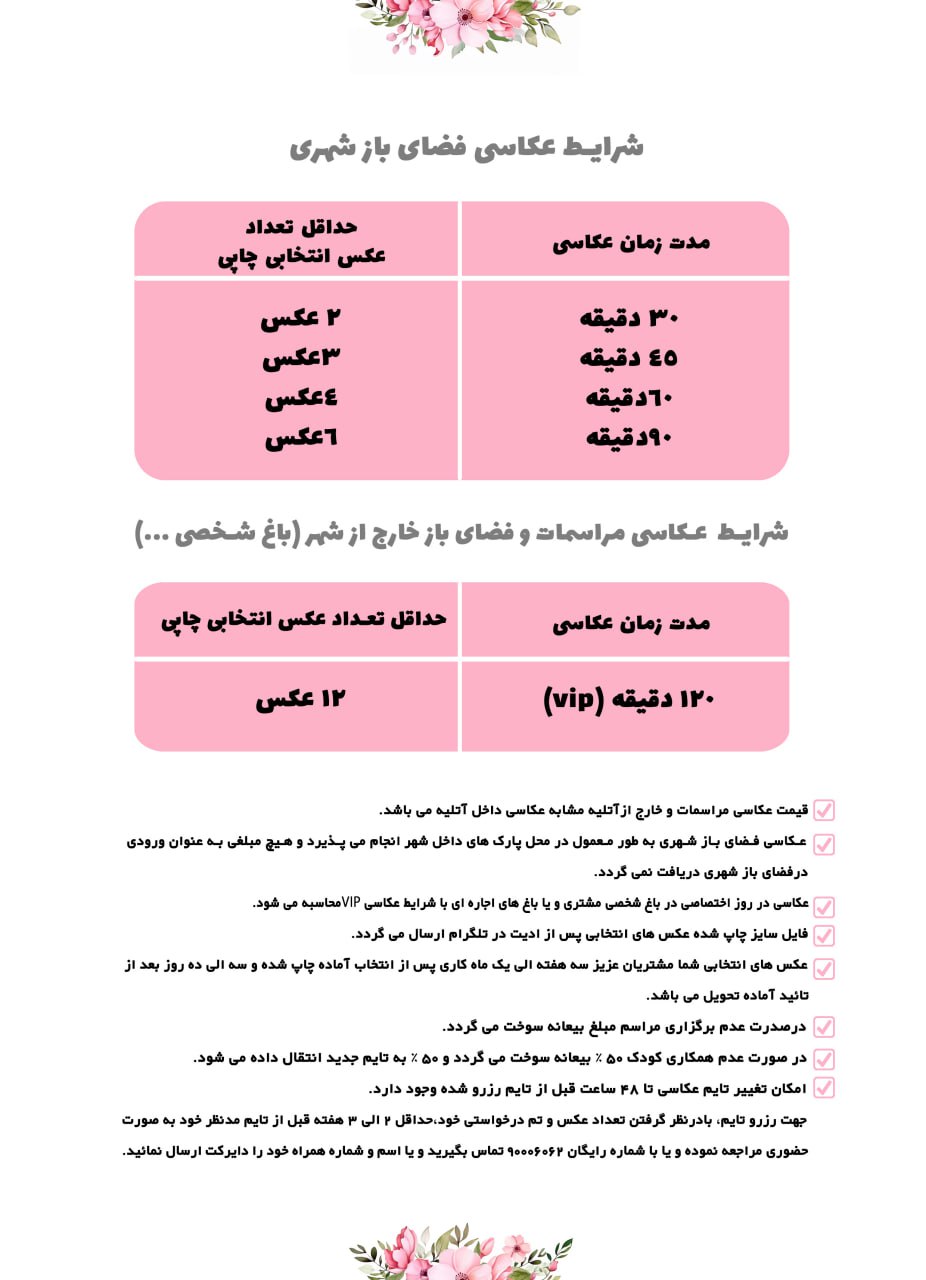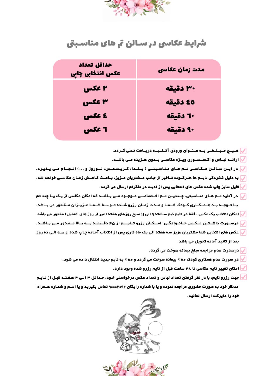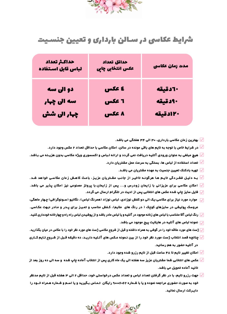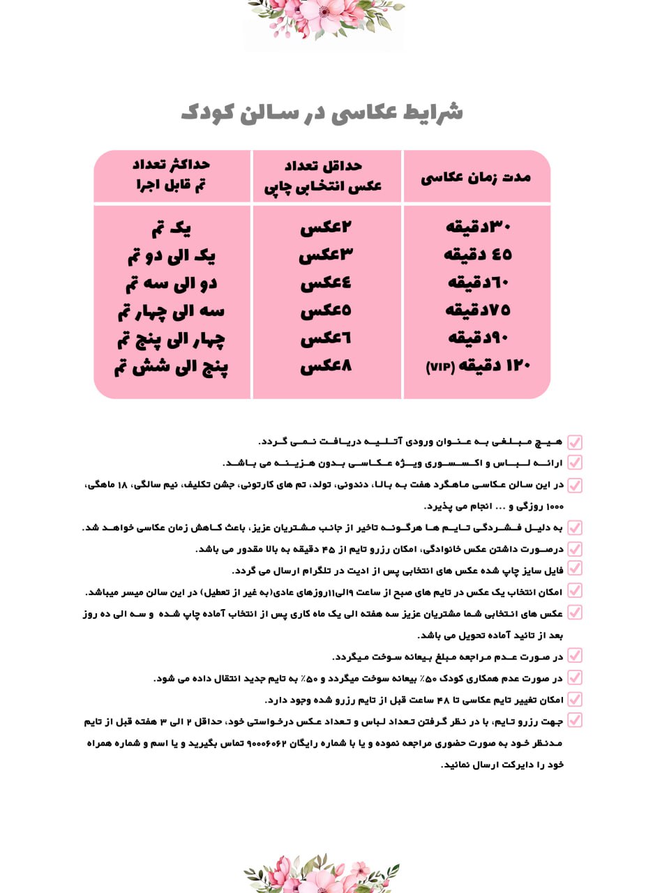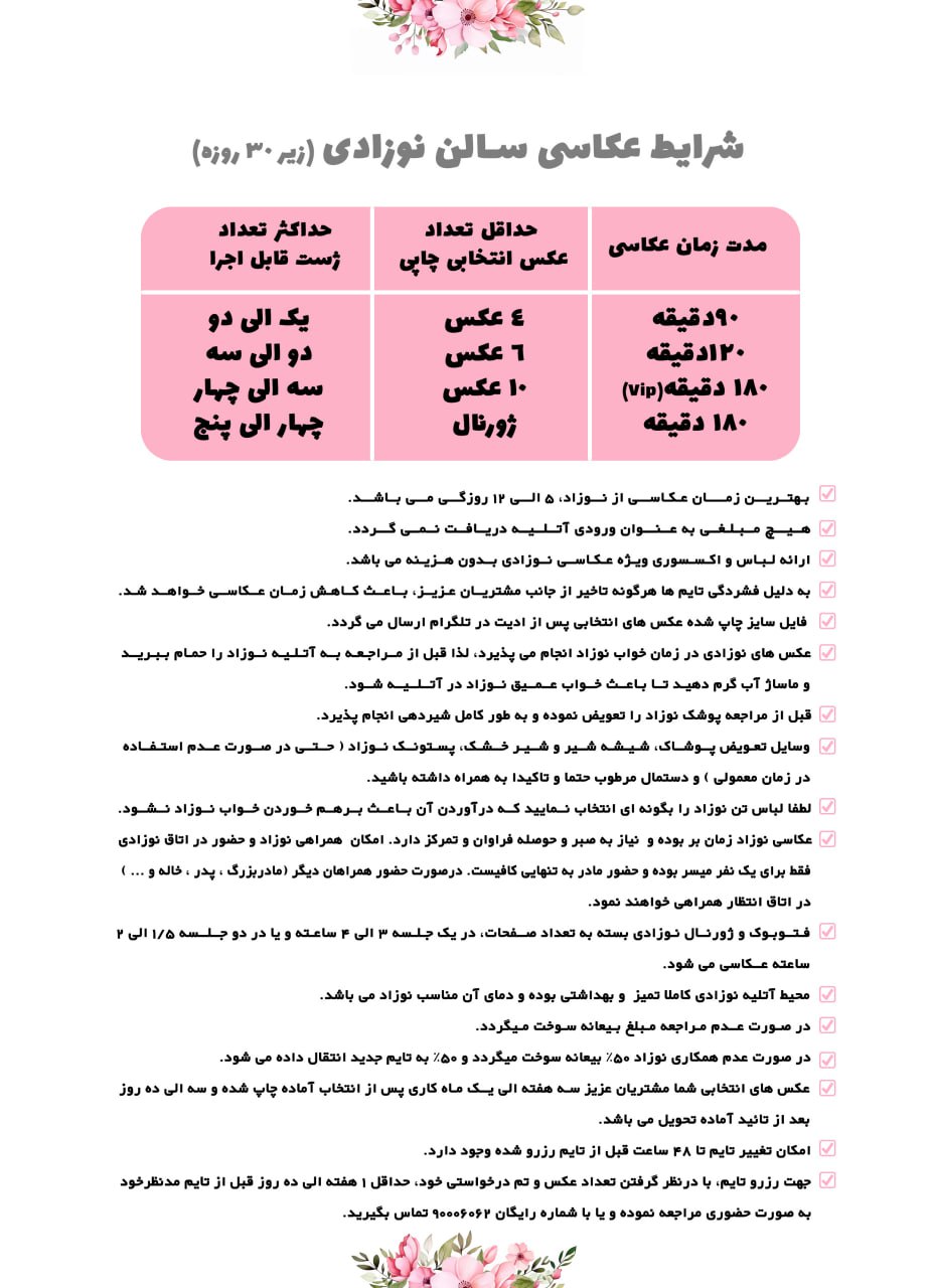 شرایط عکاسی به سایت اتلیه ی تخصصی کودک،نوزادی و بارداری نگاتیو خوش امدید . شرایط هر سالن در قسمت پایین توضیح داده شده شما میتوانید شرایط را بخوانید و تایمتون رو از هر سالنی که مدنظرتون هست رزرو کنید .