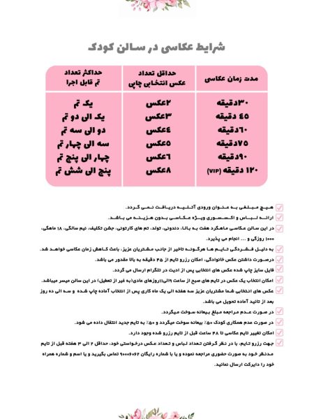 لطفا 10 دقیقه قبل از شروع تایم عکاسی در آتلیه حضور بهم رسانید.از آوردن همراه برای کودک ( مگر در موارد عکاسی خانوادگی ) خودداری نمائید.