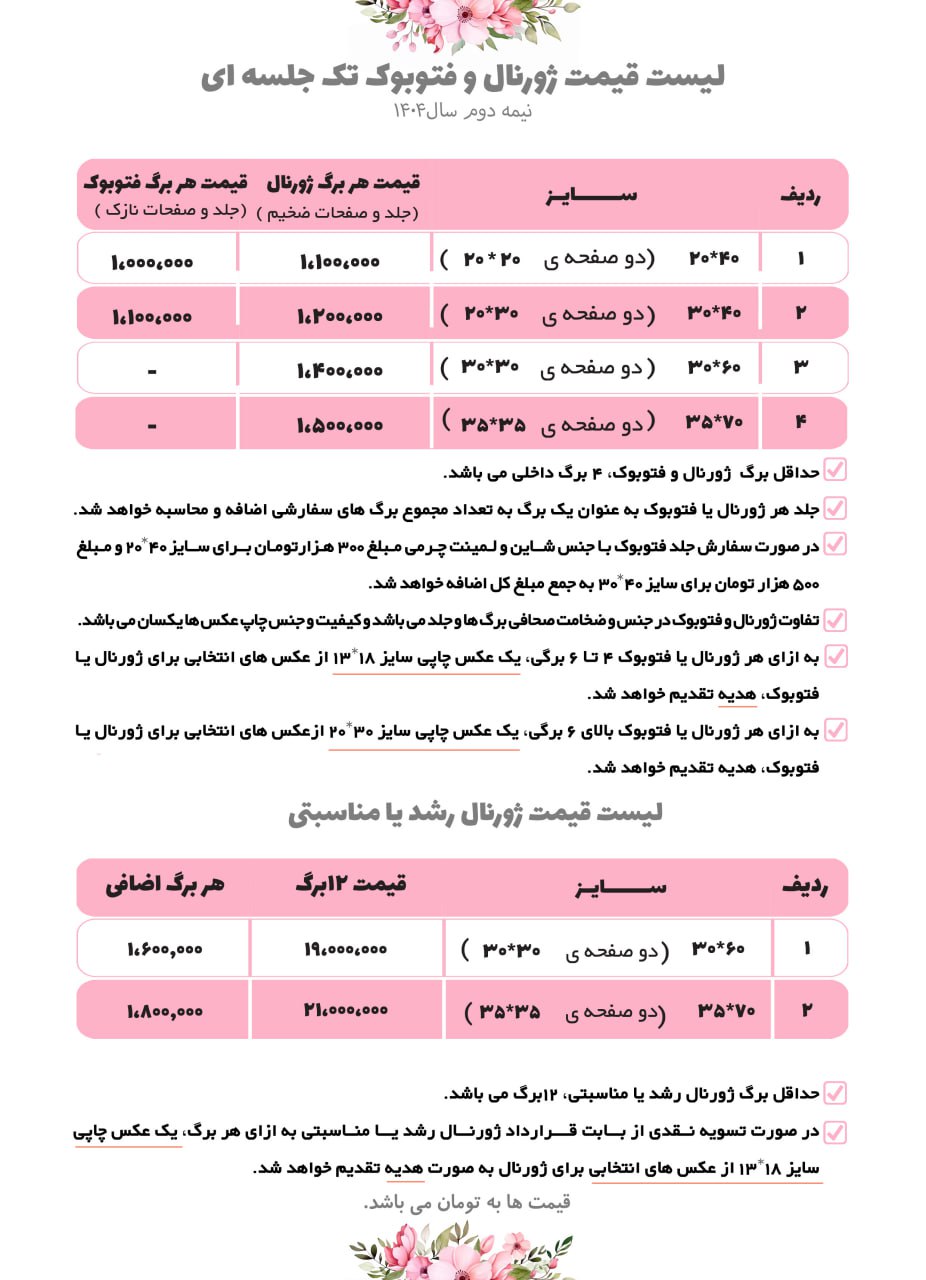 در صورت تسویه نقدی از بابت قرارداد ژورنال رشد یا مناسبتی به ازای هر برگ ، یک عکس چاپی سایز 13.18از عکس های انتخابی برای ژورنال به صورت هدیه تقدیم خواهد شد .